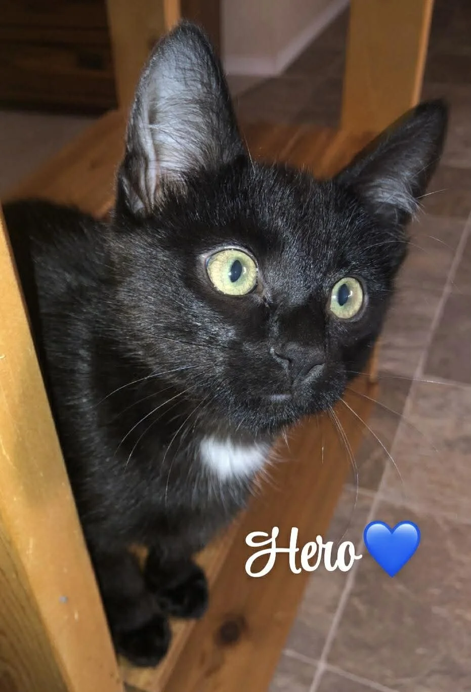 Hero is a medium-haired black kitten with a bold white spot on his chest, much like his brother Knight. But the resemblance ends there—because where Knight is small, Hero is big… and somehow getting bigger every day-not just in size, but personality, and presence too, Hero fills every room he enters.