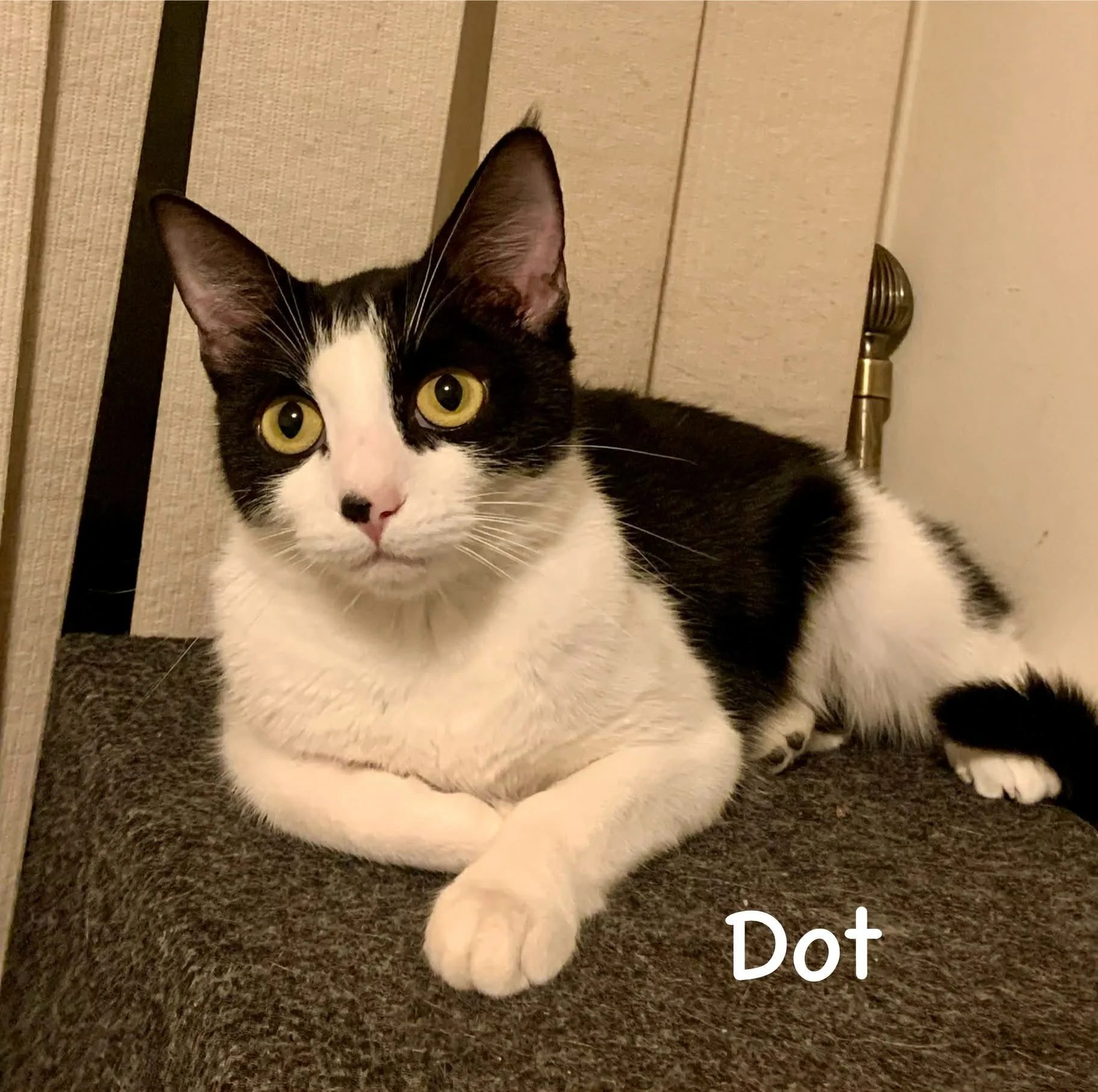 Dot gets along well with other cats once she’s had time to get comfortable, and she’d do well with a gentle feline friend. She isn’t comfortable around young children, so a home with older teens or adults would be perfect for her.